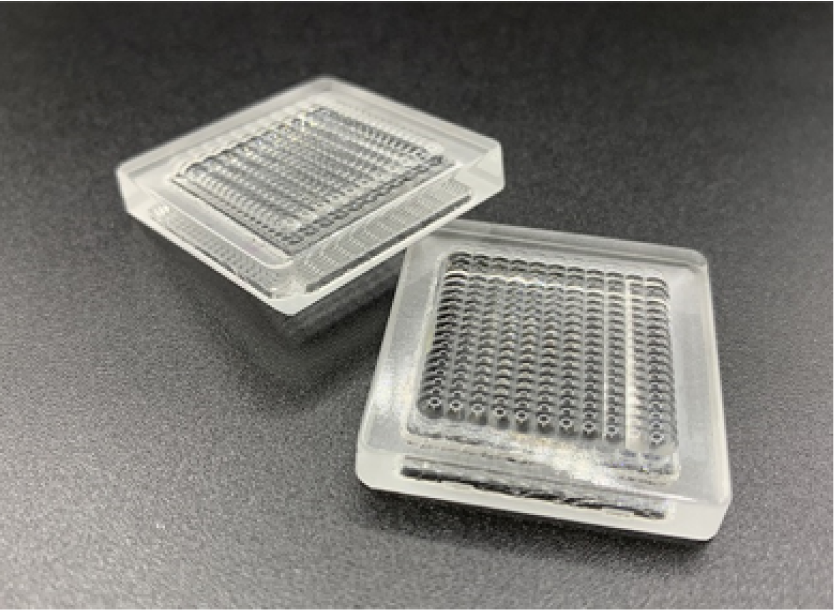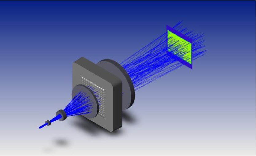 This optical system consists of a double-sided lens array and three commercially available spherical lenses.